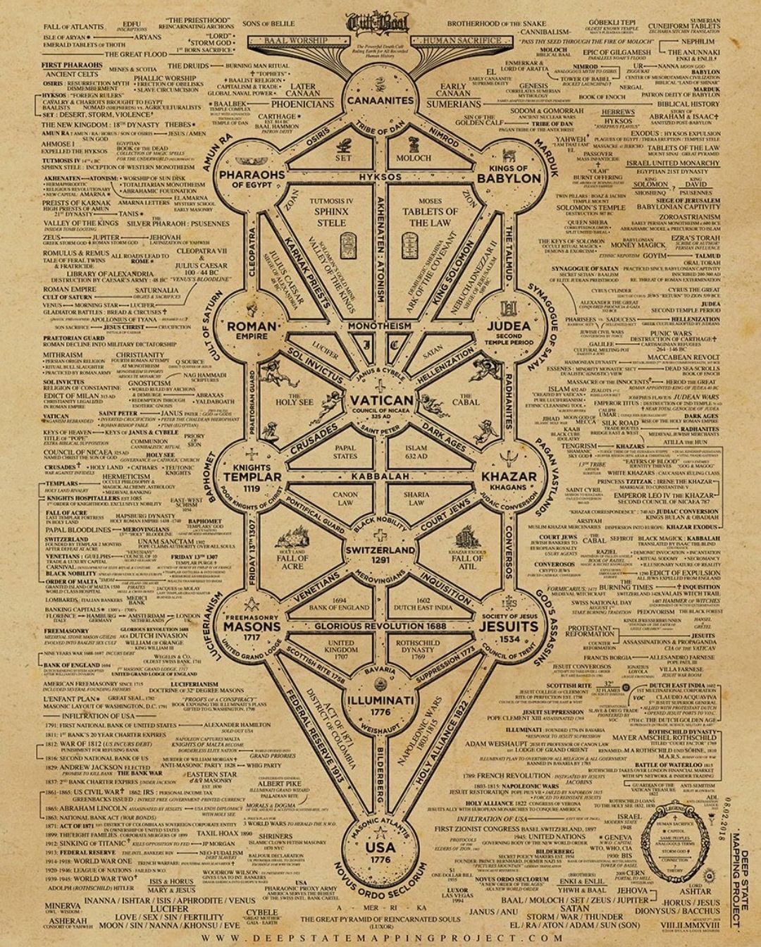 Narativul propus de acest grafic începe din negura antichității, unde rădăcinile puterii sunt identificate în Mesopotamia, Egiptul faraonic și Canaan. Autorii hărții sugerează că tradițiile ezoterice, inclusiv Cabala, au servit drept „cod sursă” pentru controlul maselor. Din această perspectivă, cunoașterea secretă nu a fost doar o căutare spirituală, ci un instrument de guvernare. Legăturile trasate între Imperiul Roman, Vatican și Cavalerii Templieri sugerează o transformare a puterii religioase în putere militară și, ulterior, financiară. De exemplu, prezența „Vaticanului” în centrul diagramei, flancat de „Cruciade” și „Iezuiți”, indică rolul central pe care instituțiile religioase l-ar fi jucat în conservarea și transmiterea acestor structuri de control de-a lungul Evului Mediu și al perioadei Dark Ages.